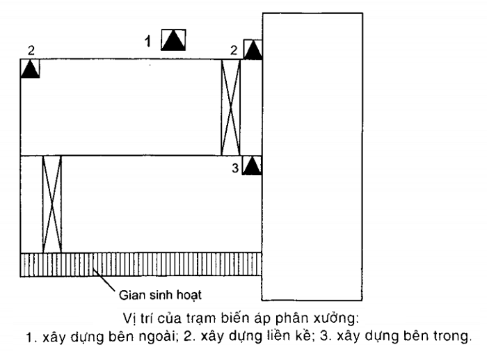 Vị trí của trạm biến áp phân xưởng có thể ở bên ngoài, liền kề hoặc bên trong phân xưởng.